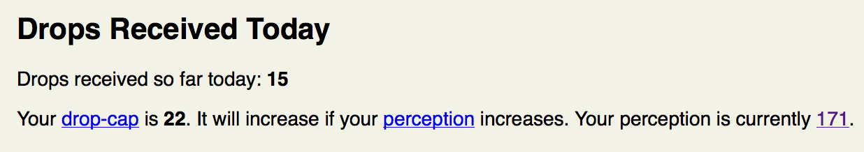 The default drop-cap is 5; this is increased by 1 for every 25 points of Perception a player has. A player with a PER of 100, for example, would have a daily drop-cap of 9. It is also increased by 1 for every contributor tier a player has. Since, as mentioned above, quest scrolls are not part of the drop system, you cannot influence when you receive a quest scroll by increasing your Perception (to raise your drop-cap).