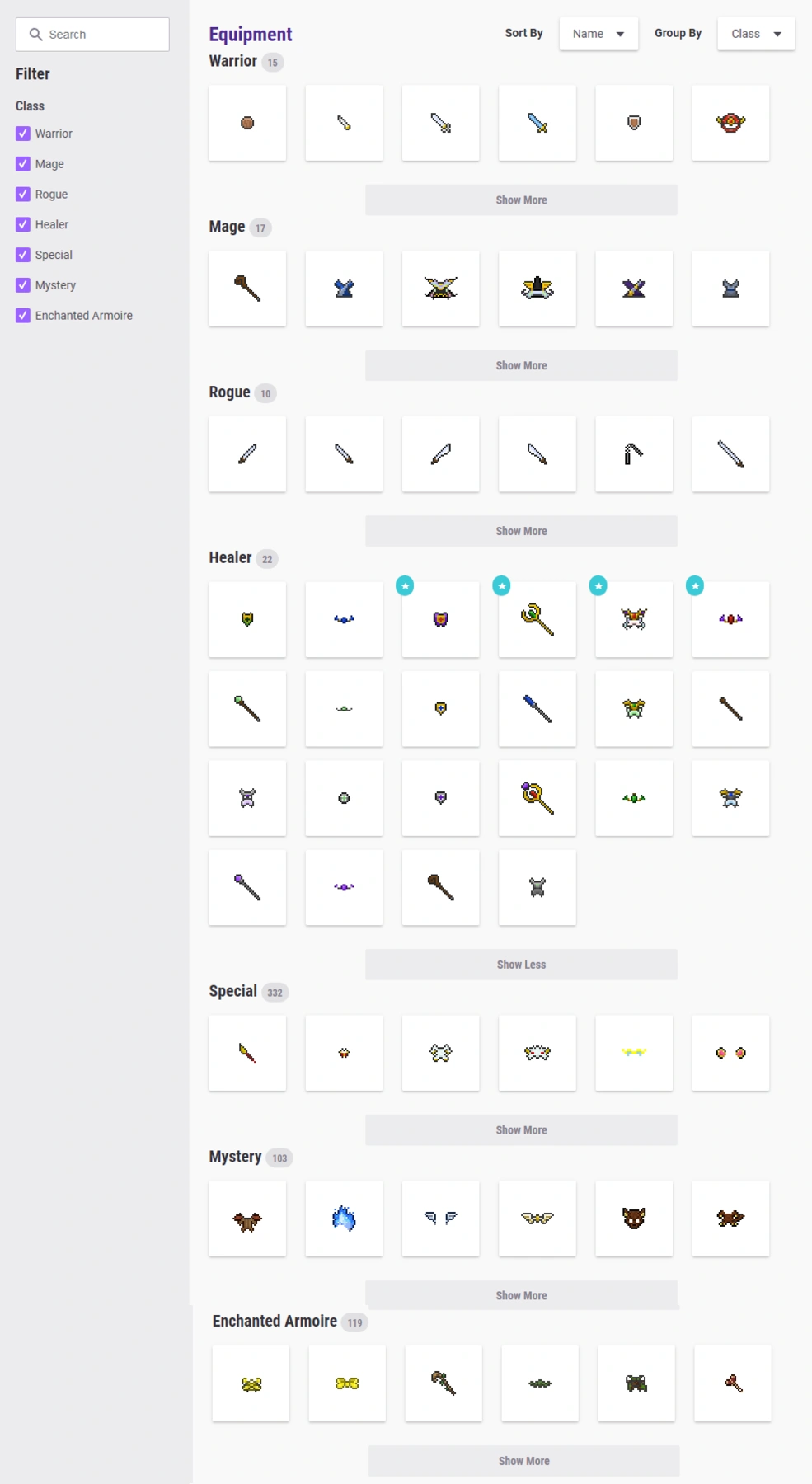 The sections below give you full information about all class equipment, grouped by class. You can also see all equipment (class and non-class) in one sortable table.