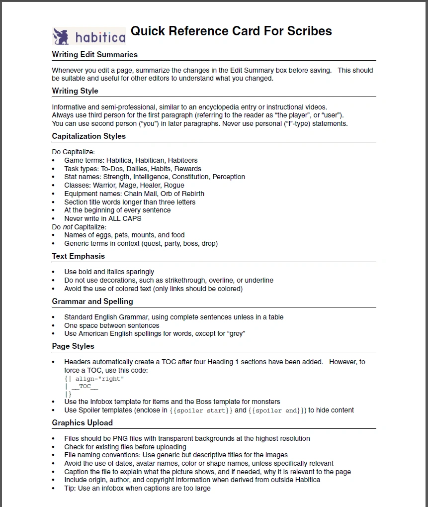 Quick Reference Card for Habitica Scribes.