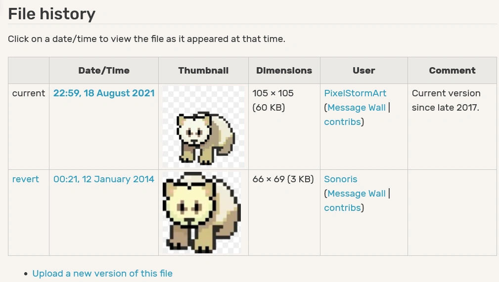 Using this method to replace an old image has a lot of advantages over uploading a completely new image. It means that you can see all versions of an image in one place, and it's very easy to revert to an old version if needed. It means that all links on the wiki and elsewhere will keep on working. It reduces clutter in the wiki's "Photo" section because there's only one entry for each image.