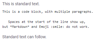 On subsequent lines, just enter the code. Long paragraphs will wrap automatically. Enter or Shift-Enter creates a line break. Enter or Shift-Enter twice adds a blank line. End the code block with another line of three backticks (```). Unlike the previous highlighted text method, this does not require four spaces at the start of every paragraph. | For international users that don't have the ` (backtick) character on the keyboard, you can insert it by typing "96" while pressing ALT. |