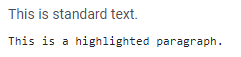 | After "This is standard text", Enter or Shift-Enter twice to start a new paragraph. Insert four spaces before "This is a highlighted paragraph." | Use this to highlight a paragraph. | |