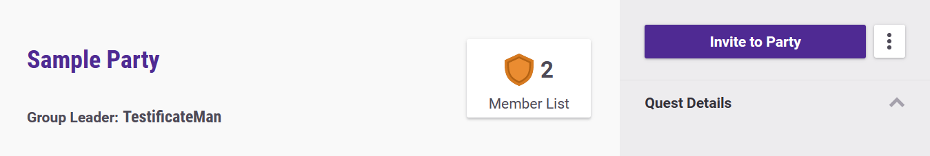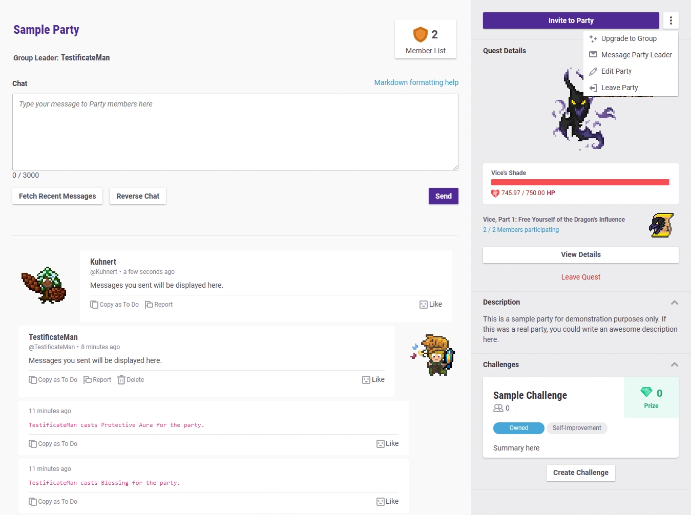 A player can either create a new party or join an existing party by accepting an invitation. Upon joining a party, every member is able see every other member's avatar in the page header. Party members are also able to communicate in a party-specific chat (found under the Party heading of the Social tab), as well as create custom challenges for party members to tackle.