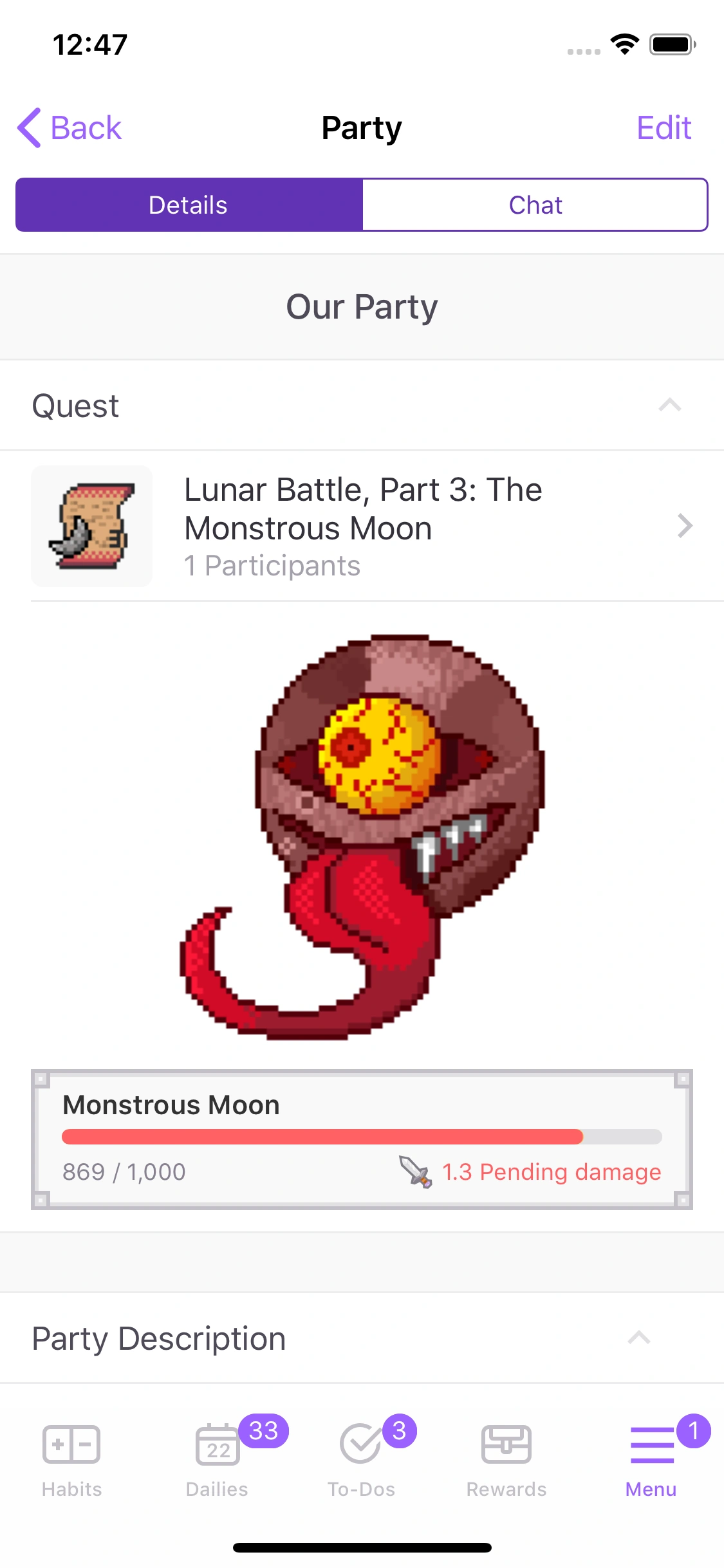 On the Habitica iOS app, players can check up on the status of their parties' quests. Here, this player's party is participating in a boss quest with their party.